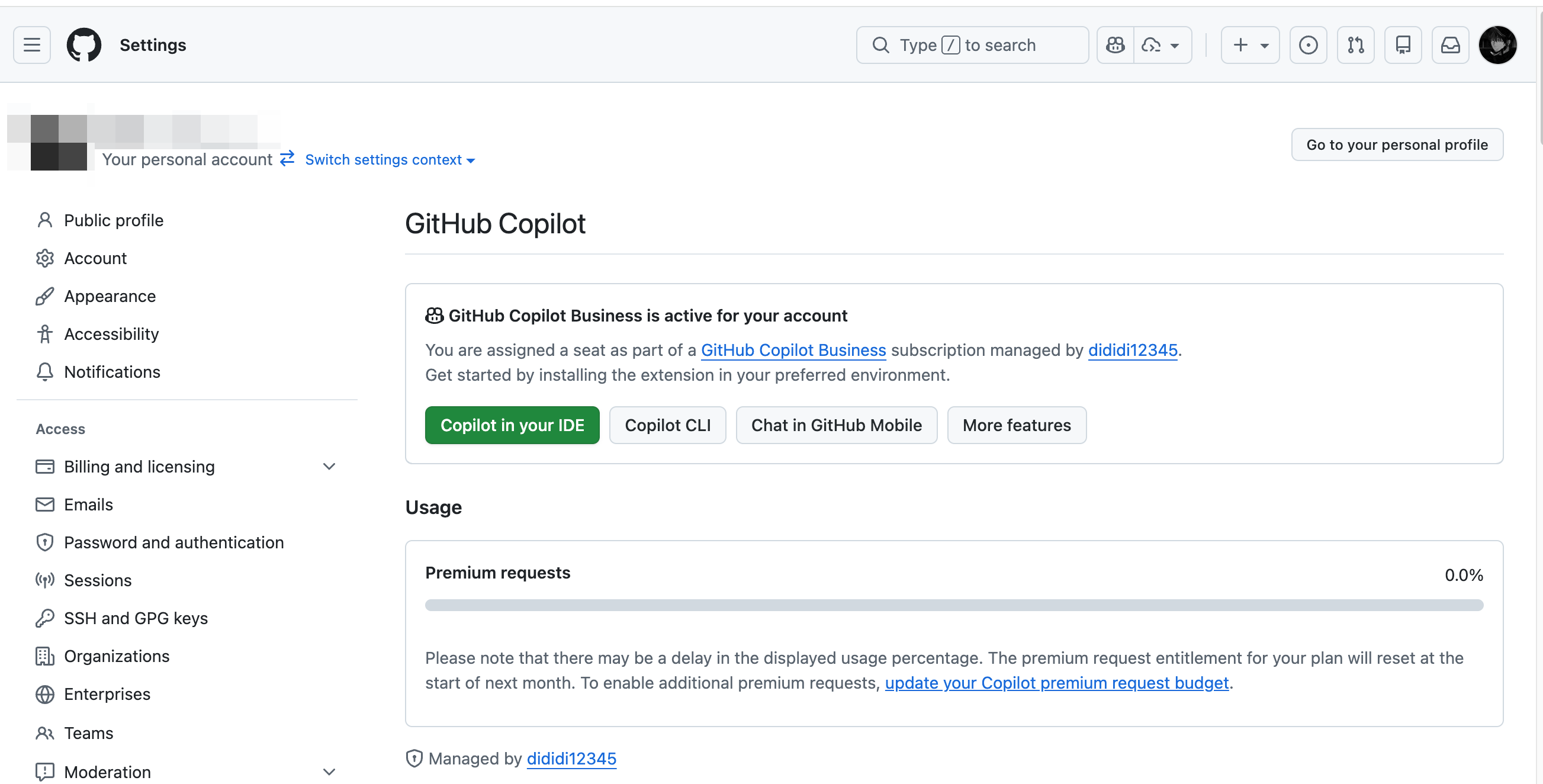 稍等几分钟同步。看到 "GitHub Copilot Business is active" 后,即可登录编辑器使用。